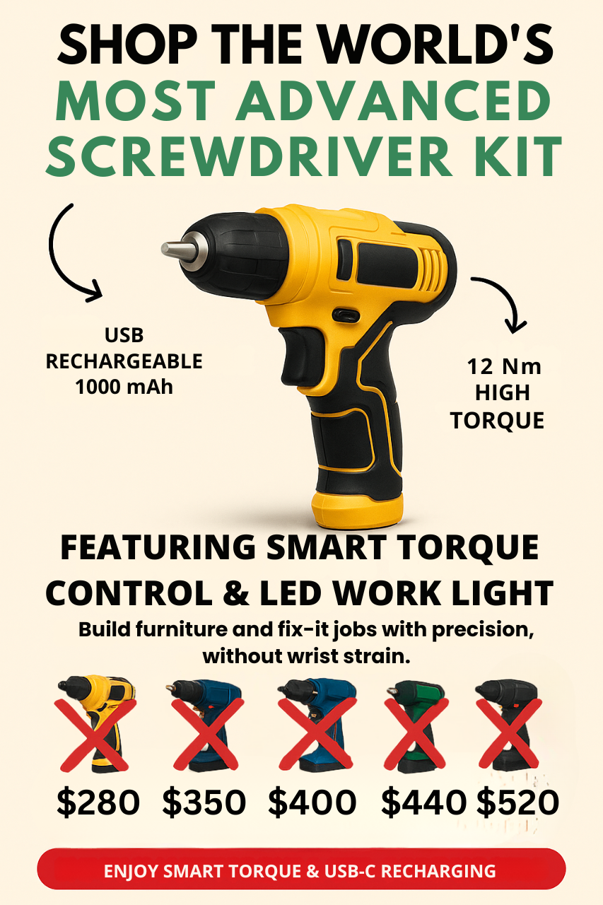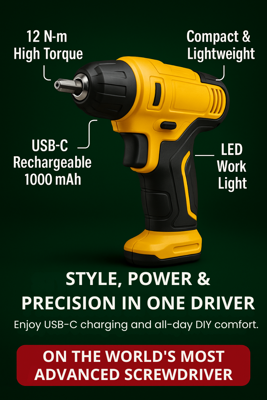 The Fixora Screw Gun delivers cordless freedom with a 1000mAh USB-rechargeable battery, making it easy to handle repairs anywhere without worrying about tangled wires.