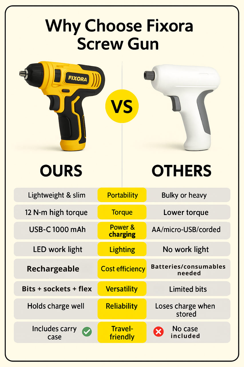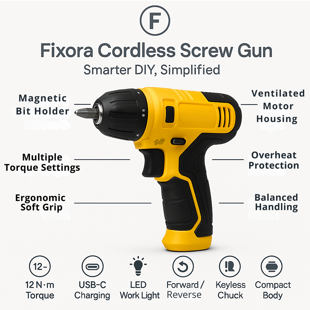 The Fixora Screw Gun has been a lifesaver. I’ve used it to assemble shelves and tighten loose screws around the house, and it’s so much quicker than doing everything manually. The USB charging makes it super convenient.